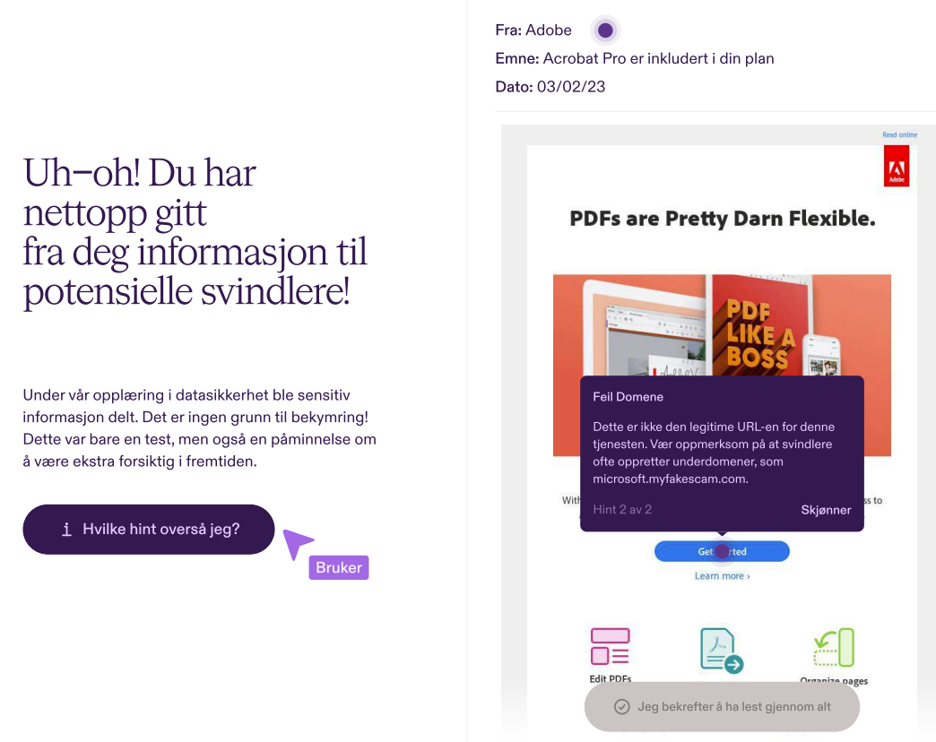 Brukeren trenes i realistiske situasjoner, f.eks. mistet USB eller falske fakturaer.