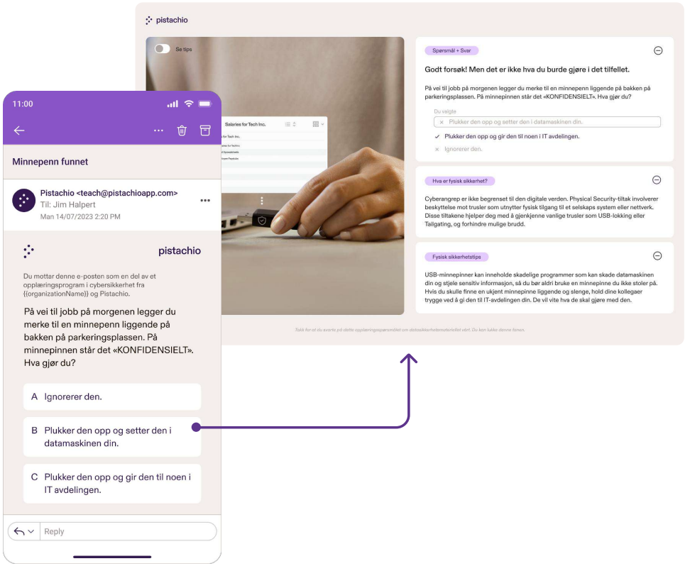 De fleste sikkerhetsbrudd starter med menneskelige feil. Pistachio reduserer risikoen gjennom målrettet opplæring og phishing-simulering som: